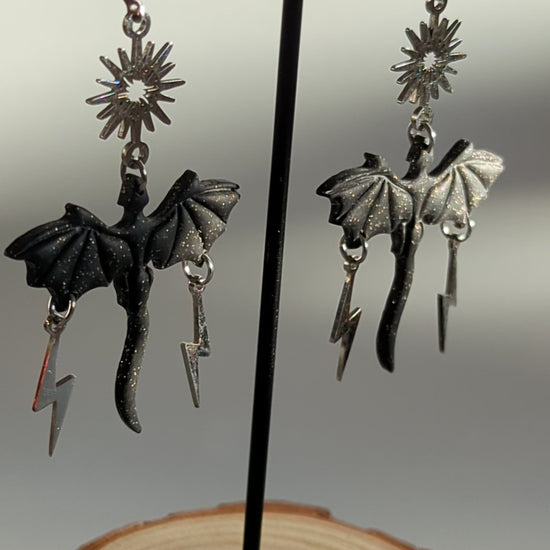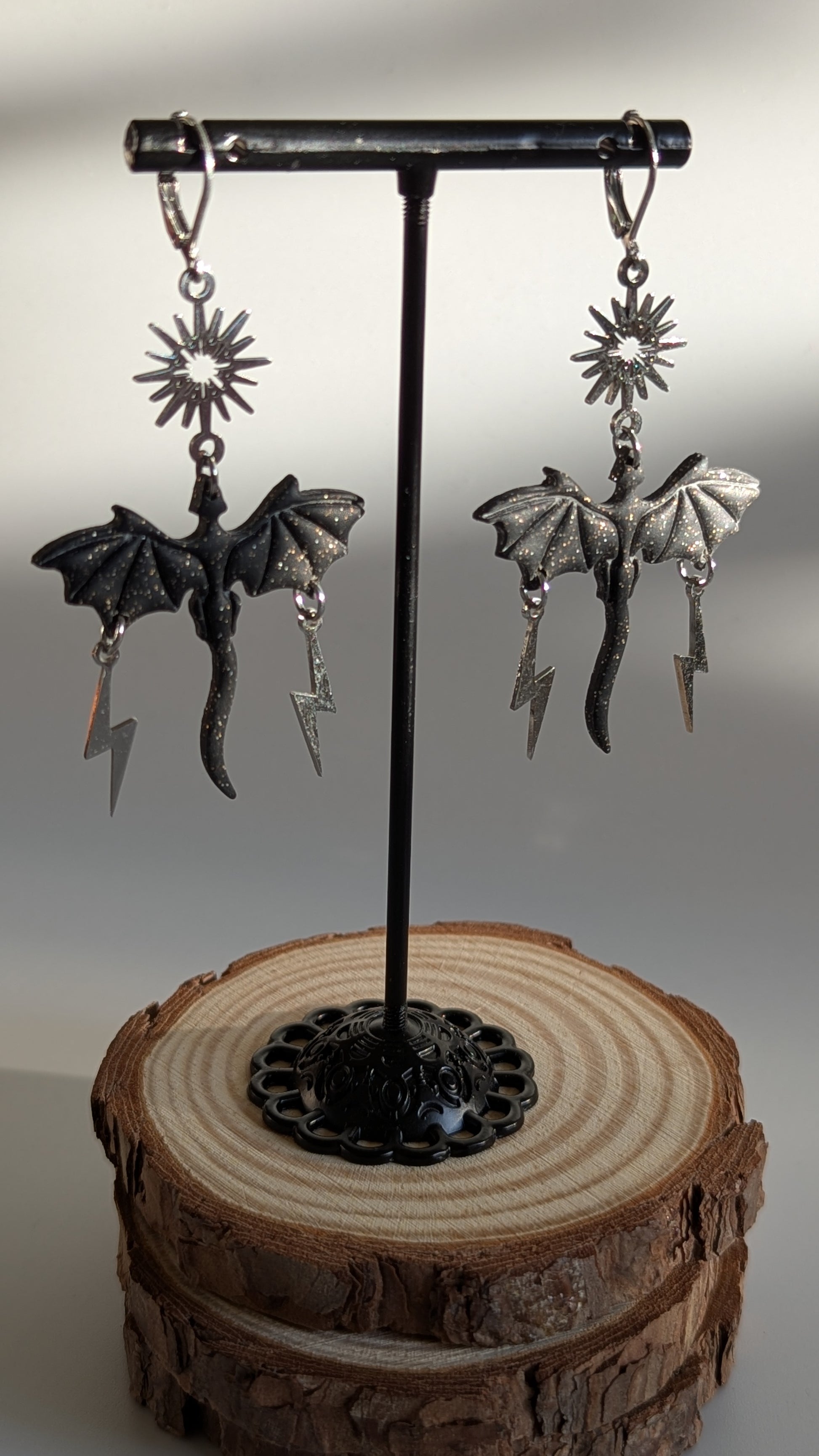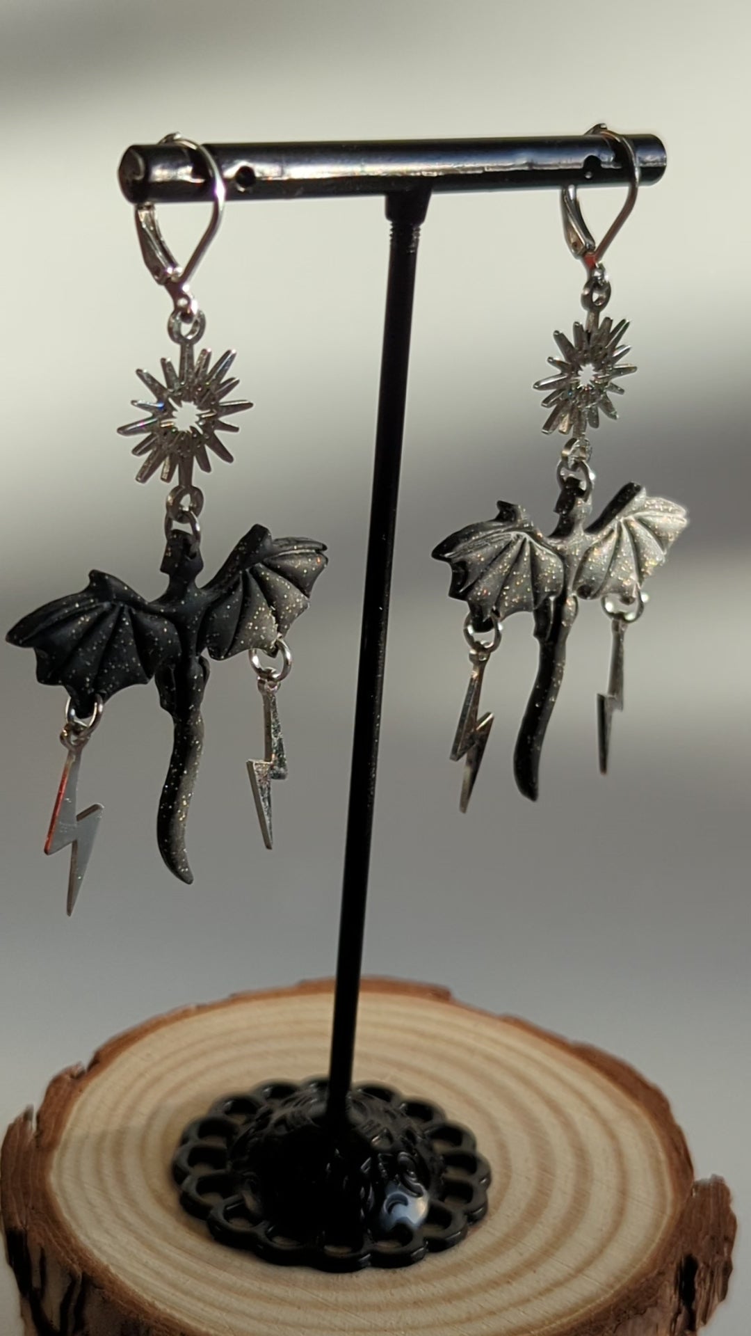 Diese handgefertigten Polymer Clay Ohrringe vereinen mystische Symbolik mit modernen Materialien. Die schwarzen Drachen mit feinen Glitzerpartikeln erinnern an Sternenstaub, während Blitze und Sonnen-Anhänger aus Edelstahl zusätzliche Power und Energie ausstrahlen. Ein echtes Statement für Fantasy- und Magie-Liebhaber!