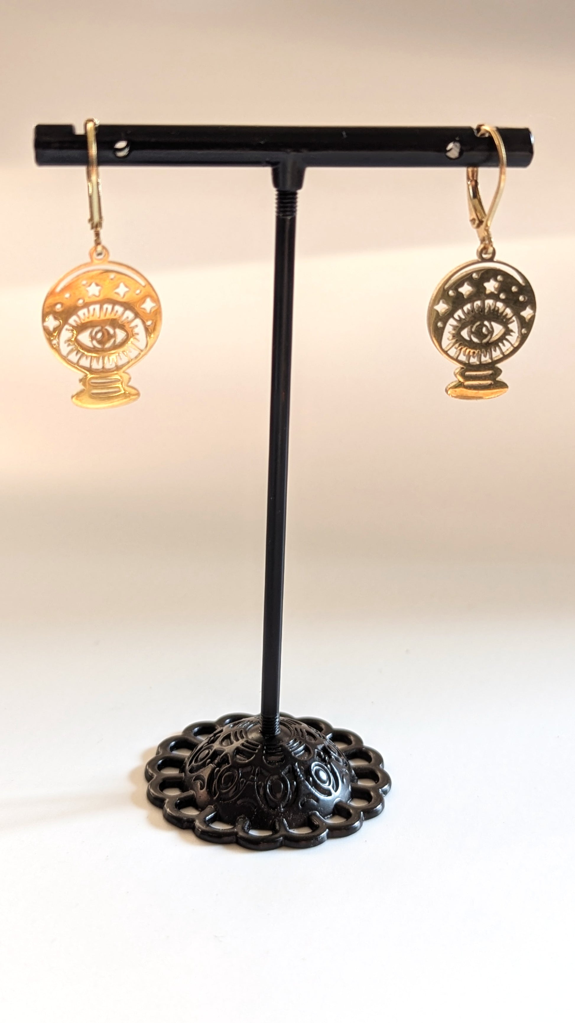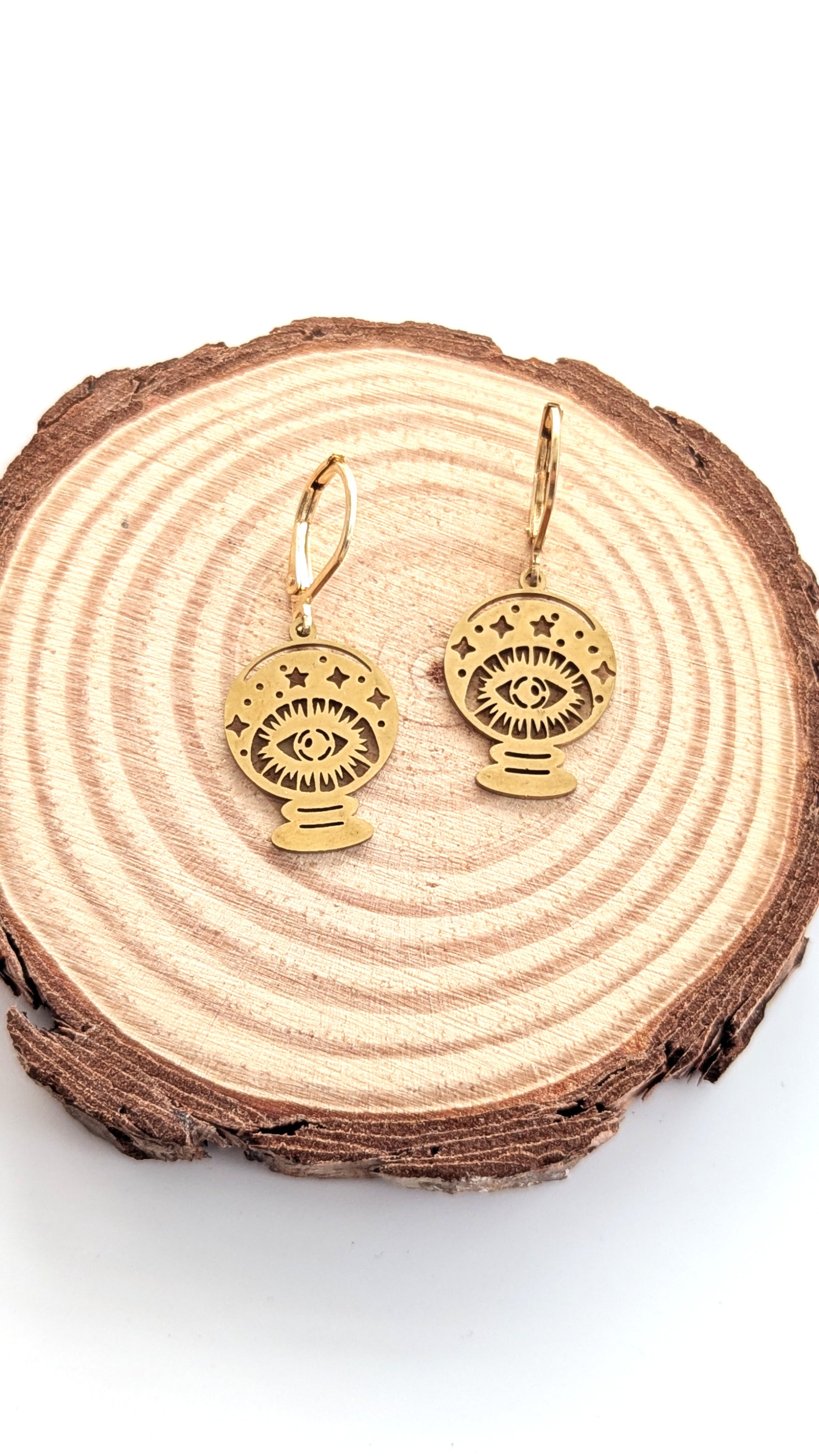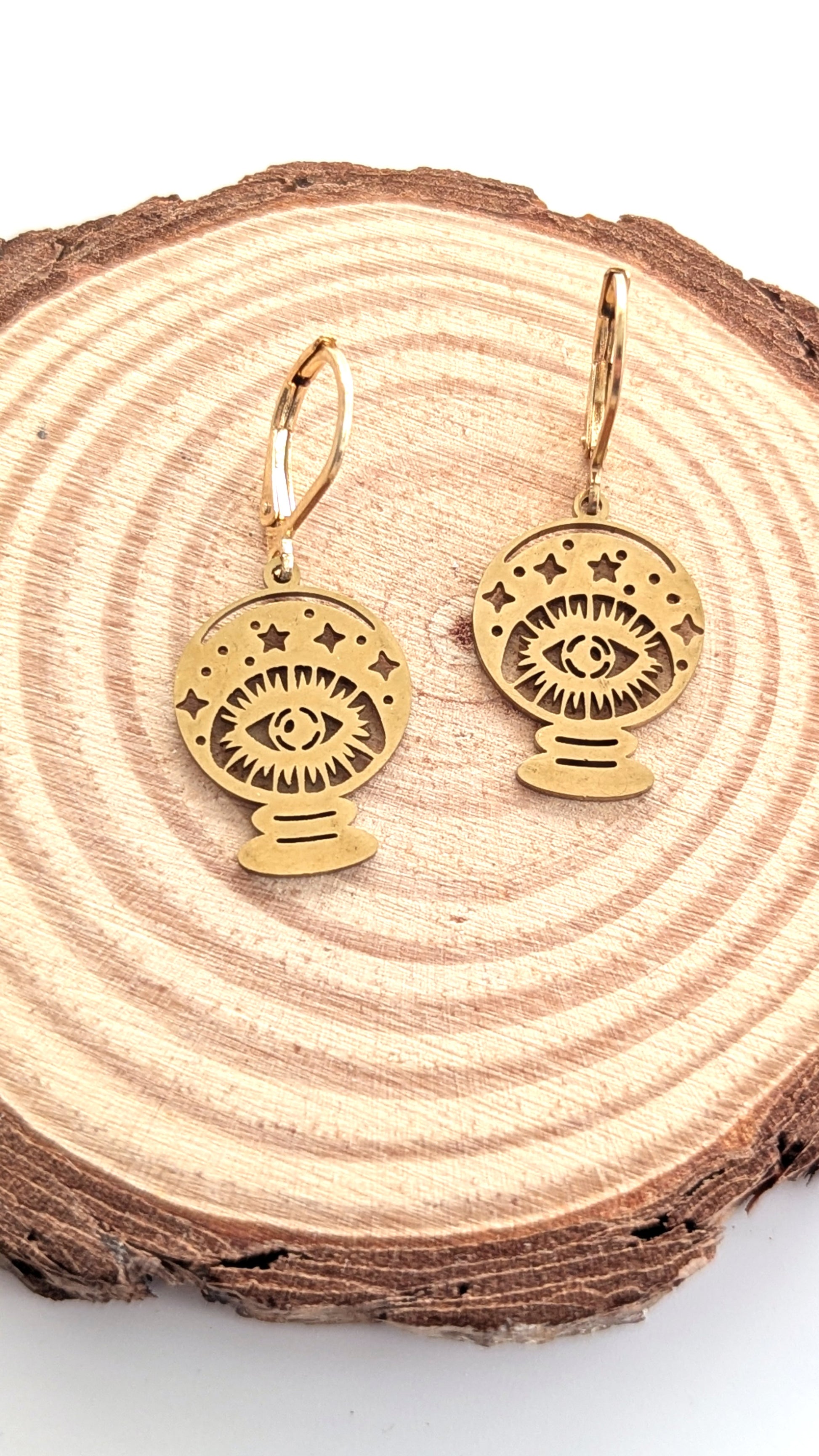 Diese goldfarbenen Edelstahl-Ohrringe vereinen symbolische Kraft und modernen Stil. Das filigrane Design zeigt eine Kristallkugel mit einem schützenden Auge, umgeben von funkelnden Sternen – ein magisches Accessoire für alle, die Spiritualität, Mystik und Boho-Ästhetik lieben.